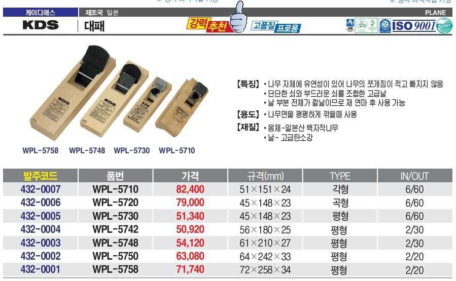 모델명 : [케이디에스][KDS]대패/날교체형 72*258*34 WPL-5758 요약정보 및 구매